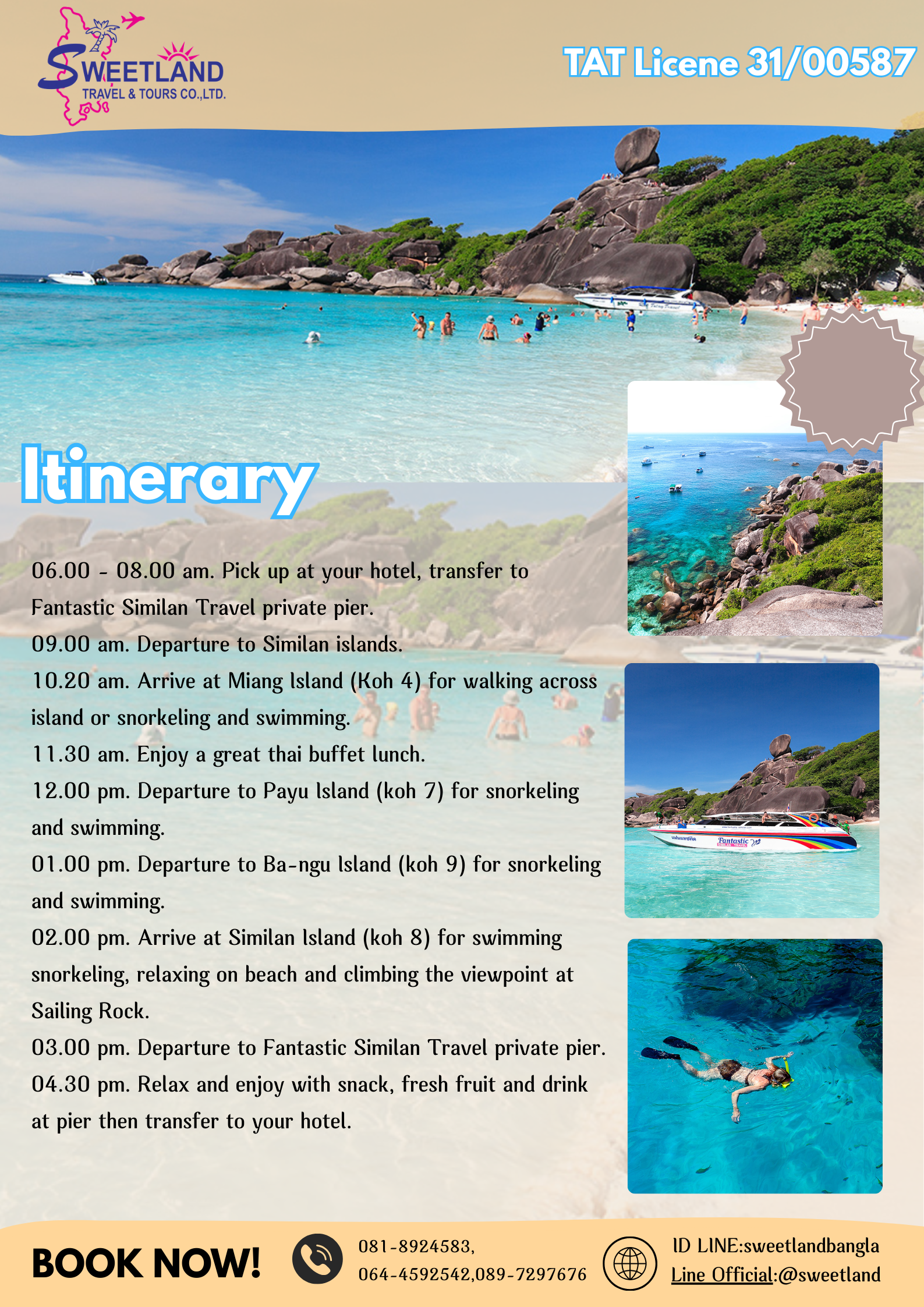| 06.00 - 08.00 AM | Pick up at your hotel, transfer to Fantastic Similan Travel private pier. |